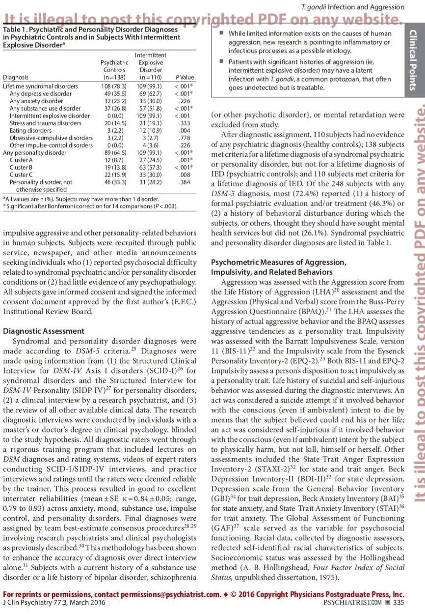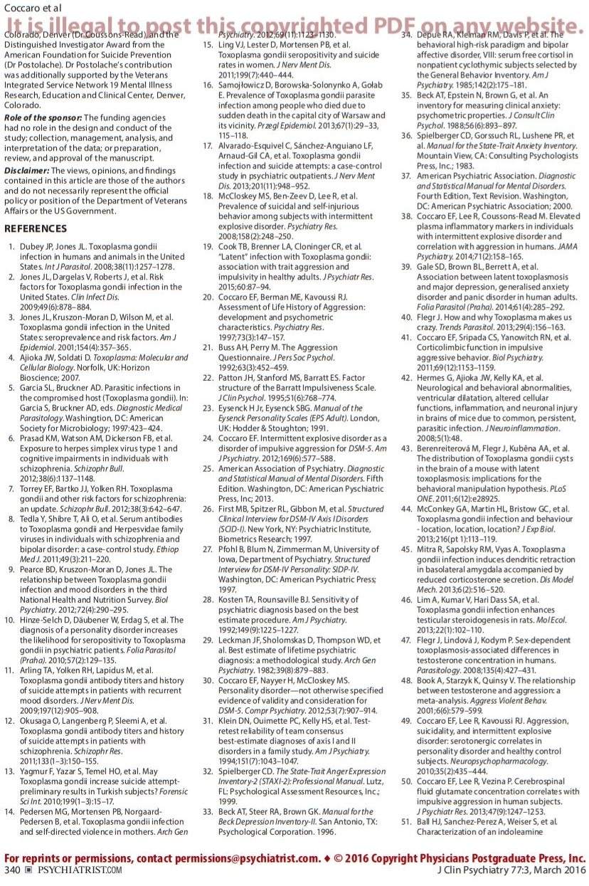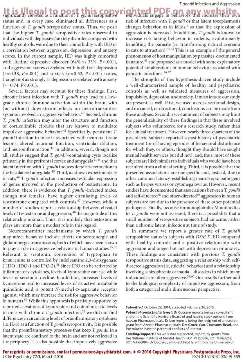 19. Cook TB, Brenner LA, Cloninger CR, et al. “Latent” infection with Toxoplasma gondii: association with trait aggression and impulsivity in healthy adults. J Psychiatr Res. 2015;60:87–94. PubMed doi:10.1016/j.jpsychires.2014.09.019 Show Abstract
