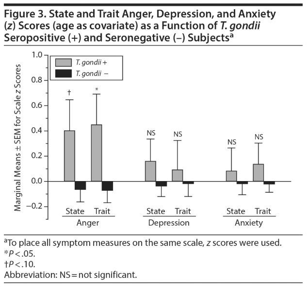 The strengths of this hypothesis-driven study include a well-characterized sample of healthy and psychiatric controls as well as validated measures of aggression, impulsivity, depression, and anxiety. Limitations to our study are present, as well. First, we used a cross-sectional design, and no causal, or directional, conclusions can be made from these analyses. Second, ascertainment of subjects may limit the generalizability of these findings in that these involved subjects who volunteered for a research study, rather than for clinical treatment. However, nearly three-quarters of the psychiatric subjects reported a past history of psychiatric treatment (or of having episodes of behavioral disturbance for which they, or others, thought they should have sought mental health services but did not), and, thus, most of these subjects are likely similar to individuals who would have been recruited from a clinical setting. Third, it is possible that the presented associations are nonspecific and, instead, due to other common latency-establishing neurotropic pathogens such as herpes viruses or cytomegalovirus. However, recent studies have documented that associations between T. gondii and self-directed58 and other-directed19 aggression in human subjects are not due to the presence of these other potential pathogens. Finally, because immunoglobulin M antibodies to T. gondii were not assessed, there is a possibility that a small number of seropositive subjects had an acute, rather than a chronic latent, infection at time of study.