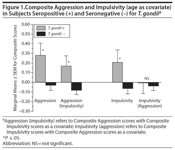 Results: T. gondii seropositive status (IgG > 12 IU) was associated with higher aggression (P = .022) and impulsivity (P = .05) scores. When both aggression and impulsivity scores were controlled for, however, only aggression scores were higher in seropositive subjects (P = .011). In addition, T. gondii seropositive status and marginal mean ± SE aggression scores increased from healthy controls (9.1% and −0.66 ± 0.05) to psychiatric controls (16.7% and −0.27 ± 0.05) to subjects with IED (21.8% and 1.15 ± 0.06; P ≤ .05). These findings were not accounted for by the presence of other syndromal/personality disorders or by states or traits related to depressed or anxious moods.