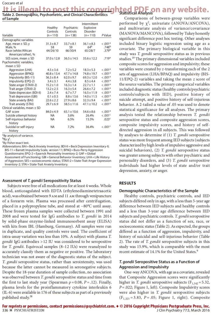 Method: IgG antibodies to T. gondii were collected between 1991 and 2008 from 358 adult subjects with DSM-5 intermittent explosive disorder (IED), non-IED psychiatric disorders (psychiatric controls), or no evidence of any psychiatric diagnosis (healthy controls). Assessments of aggression, anger, and impulsivity, as well as state/trait anger, depression, and anxiety were completed. T. gondii seropositive status (IgG > 12 IU) was the primary outcome measure for this study.