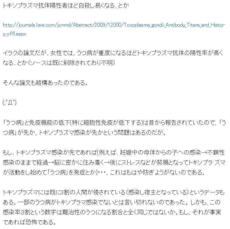 イラクの論文だが、女性では、うつ病が重度になるほどトキソプラズマ抗体の陽性率が高くなる、とか(ソースは既に削除されており不明)
