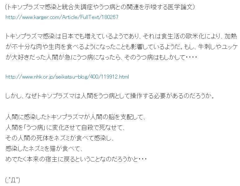 もし、トキソプラズマ感染が先であれば(例えば、妊娠中の母体からの子への感染→不顕性感染のままで経過→脳に密かに住み着く→後にストレスなどが契機となってトキソプラ ズマが活動をし始めて「うつ病」を発症とか)・・・、これはもはや防ぎようがないのである。