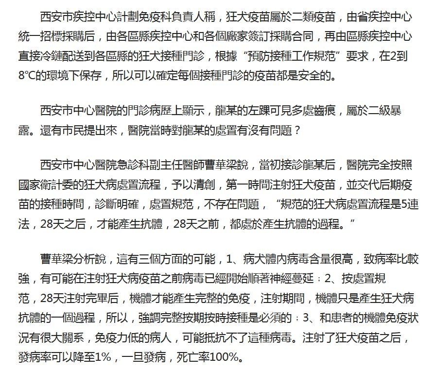 西安市中心醫院急診科副主任醫師曹華梁說,當初接診龍某后,醫院完全按照國家衛計委的狂犬病處置流程,予以清創,第一時間注射狂犬疫苗,並交代后期疫苗的接種時間,診斷明確,處置規范,不存在問題,“規范的狂犬病處置流程是5連法,28天之后,才能產生抗體,28天之前,都處於產生抗體的過程。”