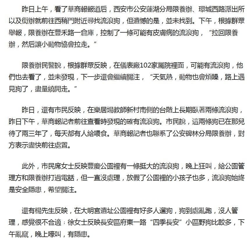 昨日上午,看了華商報報道后,西安市公安蓮湖分局限養辦、環城西路派出所以及街辦就前往西稍門附近尋找流浪狗,但遺憾的是,並未找到。下午,根據群眾舉報,限養辦在豐禾路一倉庫,控制了一條可能有皮膚病的流浪狗,“拉回限養辦,然后讓小動物協會拉走。”