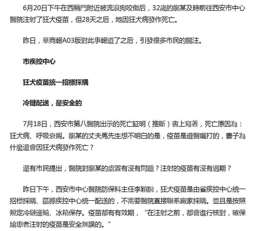 6月20日下午在西稍門附近被流浪狗咬傷后,32歲的龍某及時前往西安市中心醫院注射了狂犬疫苗,但28天之后,她因狂犬病發作死亡。