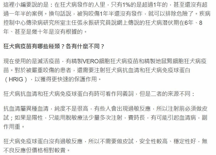 這裡小編要說的是:在狂犬病發作的人里,只有1%的是超過1年的,甚至還沒有超過一年半的案例。換句話說,被狗咬傷1年半還沒有發作,就可以排除危險了。疾病控制中心傳染病研究所室主任張永振研究員說網上傳說的狂犬病潛伏期在6年、8年、甚至是幾十年是沒有根據的。