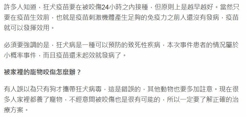 有很多人認為自家的寵物「打過疫苗」就沒關係,其實也不能保證百分百沒有風險,被咬后最好立即進行預防。