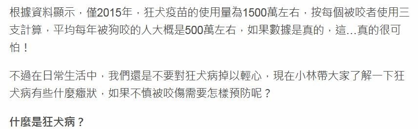 根據資料顯示,僅2015年,狂犬疫苗的使用量為1500萬左右,按每個被咬者使用三支計算,平均每年被狗咬的人大概是500萬左右,如果數據是真的,這…真的很可怕!