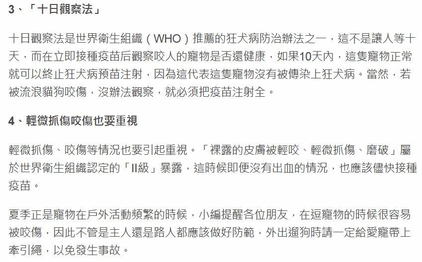 十日觀察法是世界衛生組織(WHO)推薦的狂犬病防治辦法之一,這不是讓人等十天,而在立即接種疫苗后觀察咬人的寵物是否還健康,如果10天內,這隻寵物正常就可以終止狂犬病預苗注射,因為這代表這隻寵物沒有被傳染上狂犬病。當然,若被流浪貓狗咬傷,沒辦法觀察,就必須把疫苗注射全。