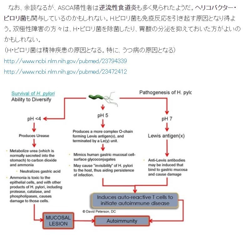 なお、余談なるが、ASCA陽性者は逆流性食道炎も多く見られたようだ。ヘリコバクター・ピロリ菌も関与しているのかもしれない。H.ピロリ菌も免疫反応を引き起す原因となり得よう。双極性障害の方々は、H・ピロリ菌を除菌したり、胃酸の分泌を抑えておいた方がよいのかもしれない。