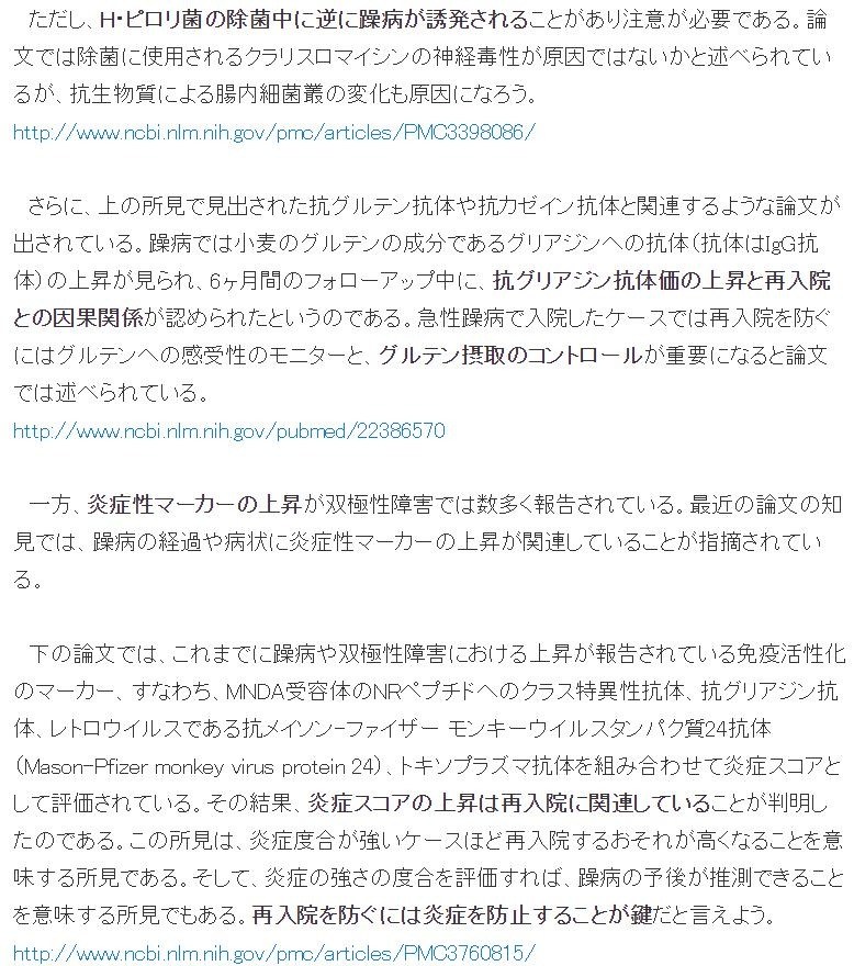 さらに、上の所見で見出された抗グルテン抗体や抗カゼイン抗体と関連するような論文が出されている。躁病では小麦のグルテンの成分であるグリアジンへの抗体(抗体はIgG抗体)の上昇が見られ、6ヶ月間のフォローアップ中に、抗グリアジン抗体価の上昇と再入院との因果関係が認められたというのである。急性躁病で入院したケースでは再入院を防ぐにはグルテンへの感受性のモニターと、グルテン摂取のコントロールが重要になると論文では述べられている。