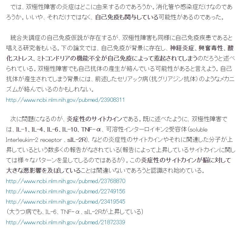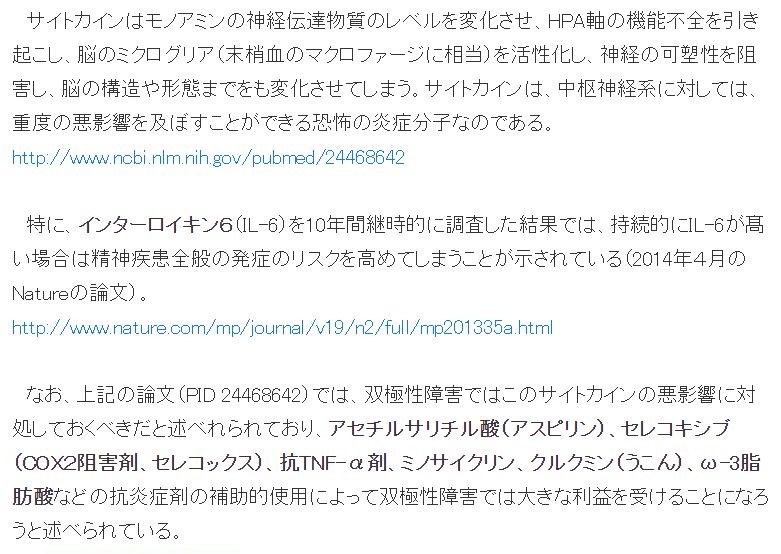 なお、上記の論文(PID 24468642)では、双極性障害ではこのサイトカインの悪影響に対処しておくべきだと述べれられており、アセチルサリチル酸(アスピリン)、セレコキシブ(COX2阻害剤、セレコックス)、抗TNF-α剤、ミノサイクリン、クルクミン(うこん)、ω-3脂肪酸などの抗炎症剤の補助的使用によって双極性障害では大きな利益を受けることになろうと述べられている。