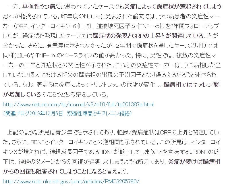 一方、単極性うつ病だと思われていたケースでも炎症によって躁症状が惹起されてしまう恐れが指摘されている。昨年度のNatureに発表された論文では、うつ病患者の炎症性マーカー(CRP、インターロイキン-6{IL-6}、腫瘍壊死因子α{TNF- α})を2年間フォローアップしたが、躁症状を発現したケースでは躁症状の発現とCRPの上昇とが関連していることが分かった。さらに、有意差は示されなかったが、2年間で躁症状を呈したケース(男性)では同様にIL-6やTNF- αのベースラインの値が髙かった。特に、男性では、複数の炎症性マーカーの上昇と躁症状との関連性が示された。これらの炎症性マーカーは、うつ病相しか呈していない個人における将来の躁病相の出現の予測因子となり得るえるだろうと述べられている。なお、著者らは炎症によってトリプトファンの代謝が変化し、躁病相ではキヌレン酸が増加しているのだろうとも考察をしている。