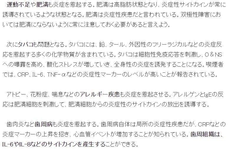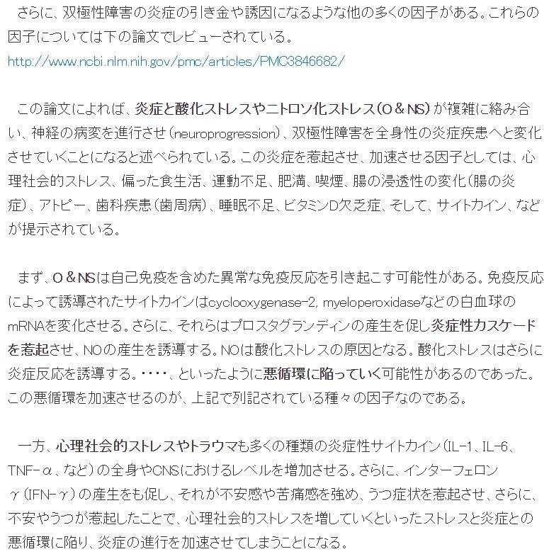 この論文によれば、炎症と酸化ストレスやニトロソ化ストレス(O&NS)が複雑に絡み合い、神経の病変を進行させ(neuroprogression)、双極性障害を全身性の炎症疾患へと変化させていくことになると述べられている。この炎症を惹起させ、加速させる因子としては、心理社会的ストレス、偏った食生活、運動不足、肥満、喫煙、腸の浸透性の変化(腸の炎症)、アトピー、歯科疾患(歯周病)、睡眠不足、ビタミンD欠乏症、そして、サイトカイン、などが提示されている。