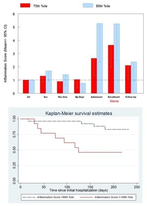 下の論文では、これまでに躁病や双極性障害における上昇が報告されている免疫活性化のマーカー、すなわち、MNDA受容体のNRペプチドへのクラス特異性抗体、抗グリアジン抗体、レトロウイルスである抗メイソン-ファイザー モンキーウイルスタンパク質24抗体(Mason-Pfizer monkey virus protein 24)、トキソプラズマ抗体を組み合わせて炎症スコアとして評価されている。その結果、炎症スコアの上昇は再入院に関連していることが判明したのである。この所見は、炎症度合が強いケースほど再入院するおそれが高くなることを意味する所見である。そして、炎症の強さの度合を評価すれば、躁病の予後が推測できることを意味する所見でもある。再入院を防ぐには炎症を防止することが鍵だと言えよう。