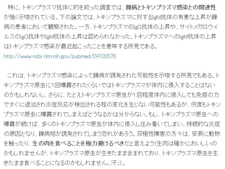 これは、トキソプラズマ感染によって躁病が誘発された可能性を示唆する所見でもある。トキソプラズマ原虫に1回曝露されたくらいではトキソプラズマが体内に侵入することはないのかもしれないし、さらに、たとえトキソプラズマ原虫が1回程度体内に侵入しても免疫の力ですぐに退治され炎症反応が検出される程の変化を生じない可能性もあるが、何度もトキソプラズマ原虫に曝露されてしまえばどうなるかは分からない。もし、トキソプラズマ原虫への曝露が続けば、多くのトキソプラズマ原虫が体内に侵入し住み着いてしまい、持続的な炎症の原因となり、躁病相が誘発されてしまう恐れがあろう。双極性障害の方々は、安易に動物を触ったり、生の肉を食べることを極力避けるべきだと言えよう(生肉は確かにおいしいのかもしれませんが、トキソプラズマ原虫が生きたまま含まれており、トキソプラズマ原虫を生きたまま食べることになるのかもしれません。汗;)。