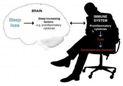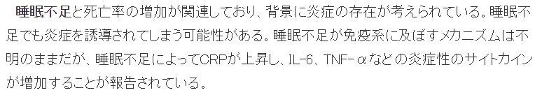 睡眠不足と死亡率の増加が関連しており、背景に炎症の存在が考えられている。睡眠不足でも炎症を誘導されてしまう可能性がある。睡眠不足が免疫系に及ぼすメカニズムは不明のままだが、睡眠不足によってCRPが上昇し、IL-6、TNF-αなどの炎症性のサイトカインが増加することが報告されている。