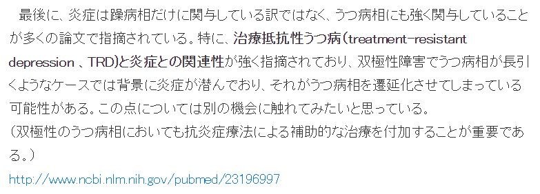 最後に、炎症は躁病相だけに関与している訳ではなく、うつ病相にも強く関与していることが多くの論文で指摘されている。特に、治療抵抗性うつ病(treatment-resistant depression 、TRD)と炎症との関連性が強く指摘されており、双極性障害でうつ病相が長引くようなケースでは背景に炎症が潜んでおり、それがうつ病相を遷延化させてしまっている可能性がある。この点については別の機会に触れてみたいと思っている。
