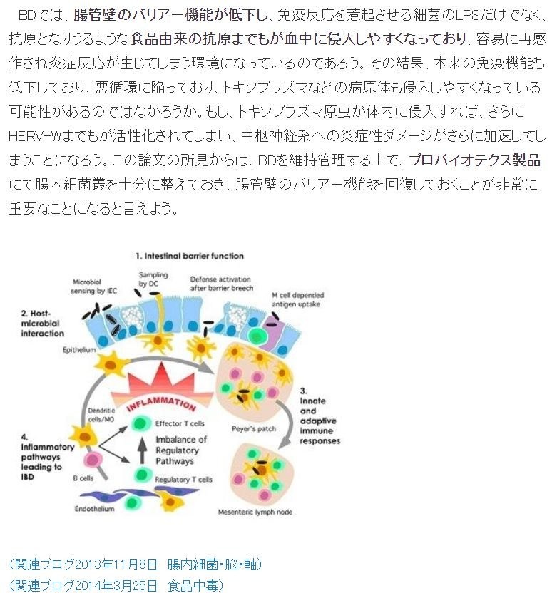 BDでは、腸管壁のバリアー機能が低下し、免疫反応を惹起させる細菌のLPSだけでなく、抗原となりうるような食品由来の抗原までもが血中に侵入しやすくなっており、容易に再感作され炎症反応が生じてしまう環境になっているのであろう。その結果、本来の免疫機能も低下しており、悪循環に陥っており、トキソプラズマなどの病原体も侵入しやすくなっている可能性があるのではなかろうか。もし、トキソプラズマ原虫が体内に侵入すれば、さらにHERV-Wまでもが活性化されてしまい、中枢神経系への炎症性ダメージがさらに加速してしまうことになろう。この論文の所見からは、BDを維持管理する上で、プロバイオテクス製品にて腸内細菌叢を十分に整えておき、腸管壁のバリアー機能を回復しておくことが非常に重要なことになると言えよう。