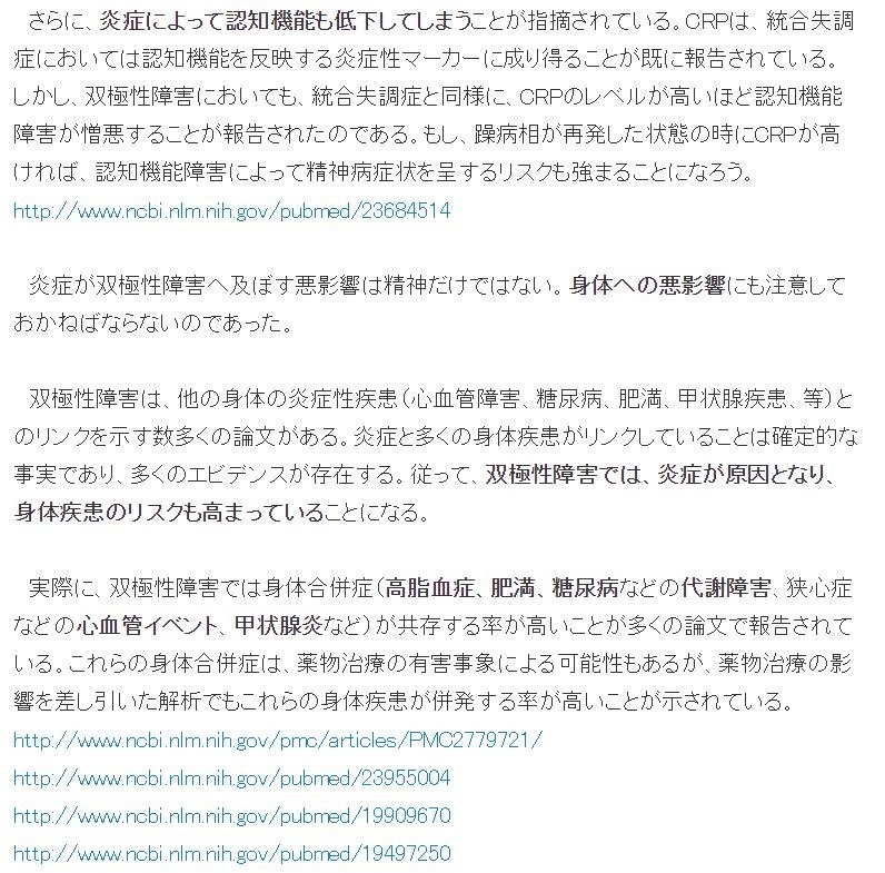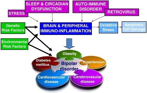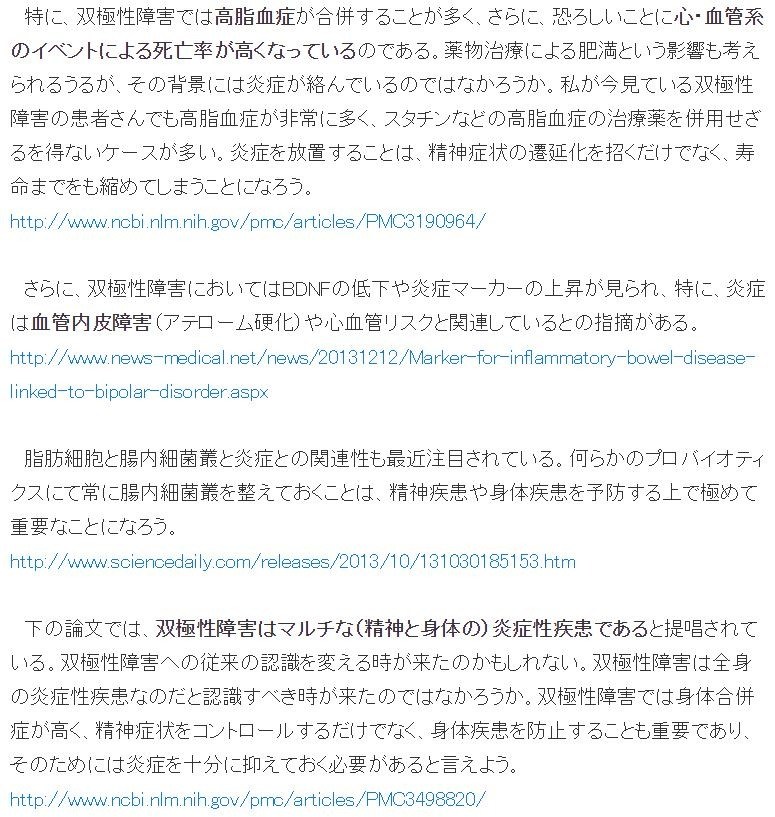 双極性障害は、他の身体の炎症性疾患(心血管障害、糖尿病、肥満、甲状腺疾患、等)とのリンクを示す数多くの論文がある。炎症と多くの身体疾患がリンクしていることは確定的な事実であり、多くのエビデンスが存在する。従って、双極性障害では、炎症が原因となり、身体疾患のリスクも高まっていることになる。