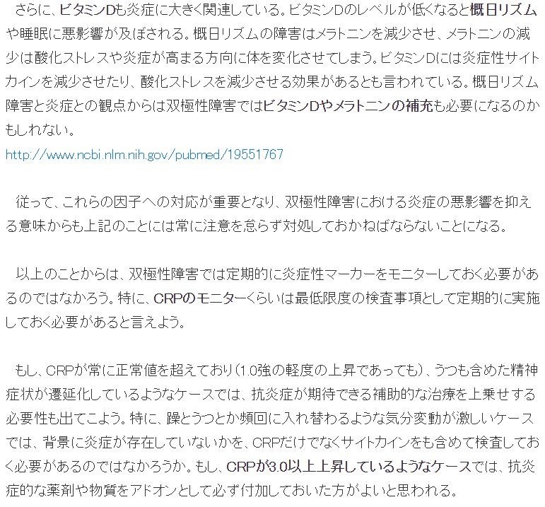 もし、CRPが常に正常値を超えており(1.0強の軽度の上昇であっても)、うつも含めた精神症状が遷延化しているようなケースでは、抗炎症が期待できる補助的な治療を上乗せする必要性も出てこよう。特に、躁とうつとか頻回に入れ替わるような気分変動が激しいケースでは、背景に炎症が存在していないかを、CRPだけでなくサイトカインをも含めて検査しておく必要があるのではなかろうか。もし、CRPが3.0以上上昇しているようなケースでは、抗炎症的な薬剤や物質をアドオンとして必ず付加しておいた方がよいと思われる。