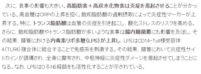 次に、食事の影響も大きい。高脂肪食+高炭水化物食は炎症を惹起させることが分かっている。高血糖はCRPの上昇を招く。飽和脂肪酸の過剰摂取によって炎症性マーカーが上昇する。特に、トランス脂肪酸は血管の炎症を引き起こし、酸化ストレスのリスクを高める。さらに、飽和脂肪酸やトランス脂肪酸が多いような食事は腸内細菌叢にも影響を及ぼし、その結果、腸管における内毒素リポ多糖(LPS)が上昇し、LPSはCD14-Toll様受容体4(TLR4)複合体に結合することで免疫系を刺激する。その結果、腸管において炎症性サイトカインが誘導され、全身に撒布され、中枢神経に炎症性ダメージを惹起させてしまうことになる。なお、LPSはO&NS経路をも活性化することが示されている。