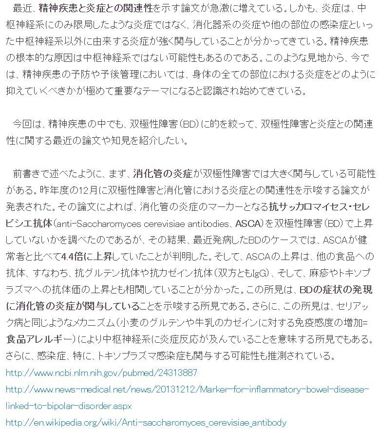 前書きで述べたように、まず、消化管の炎症が双極性障害では大きく関与している可能性がある。昨年度の12月に双極性障害と消化管における炎症との関連性を示唆する論文が発表された。その論文によれば、消化管の炎症のマーカーとなる抗サッカロマイセス・セレビシエ抗体(anti-Saccharomyces cerevisiae antibodies、ASCA)を双極性障害(BD)で上昇していないかを調べたのであるが、その結果、最近発病したBDのケースでは、ASCAが健常者と比べて4.4倍に上昇していたことが判明した。そして、ASCAの上昇は、他の食品への抗体、すなわち、抗グルテン抗体や抗カゼイン抗体(双方ともIgG)、そして、麻疹やトキソプラズマへの抗体価の上昇とも相関していることが分かった。この所見は、BDの症状の発現に消化管の炎症が関与していることを示唆する所見である。さらに、この所見は、セリアック病と同じようなメカニズム(小麦のグルテンや牛乳のカゼインに対する免疫感度の増加=食品アレルギー)により中枢神経系に炎症反応が及んでいることを意味する所見でもある。さらに、感染症、特に、トキソプラズマ感染症も関与する可能性も推測されている。