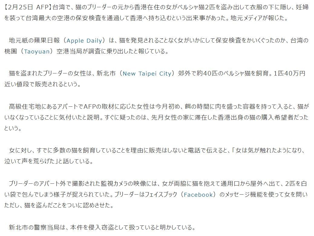 【2月25日 AFP】台湾で、のブリーダーの元から香港在住の女がペルシャ2匹を盗み出して衣服の下に隠し、妊婦を装って台湾最大の空港の保安検査を通過して香港へ持ち込むという出来事があった。地元メディアが報じた。