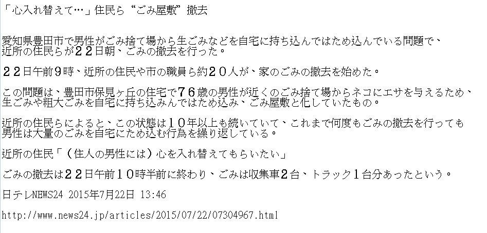この問題は、豊田市保見ヶ丘の住宅で76歳の男性が近くのごみ捨て場からネコにエサを与えるため、 生ごみや粗大ごみを自宅に持ち込みんではため込み、ごみ屋敷と化していたもの。