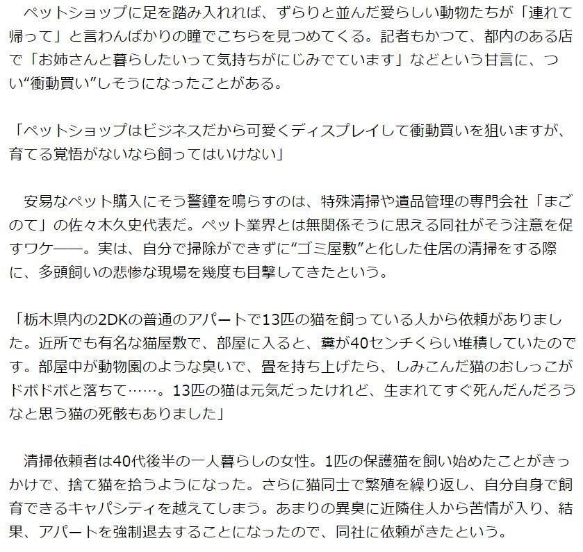 安易なペット購入にそう警鐘を鳴らすのは、特殊清掃や遺品管理の専門会社「まごのて」の佐々木久史代表だ。ペット業界とは無関係そうに思える同社がそう注意を促すワケ――。実は、自分で掃除ができずに“ゴミ屋敷”と化した住居の清掃をする際に、多頭飼いの悲惨な現場を幾度も目撃してきたという。