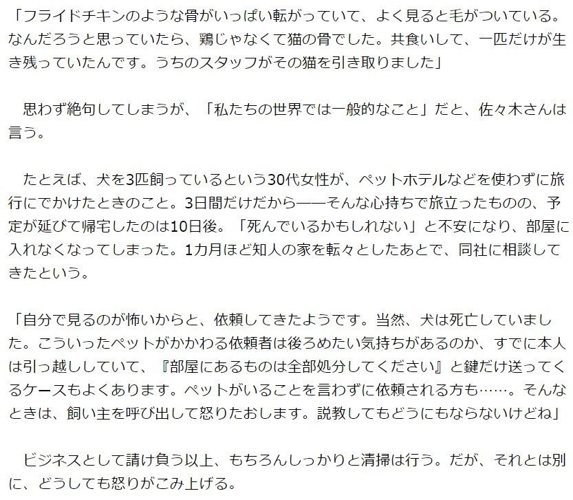 「自分で見るのが怖いからと、依頼してきたようです。当然、は死亡していました。こういったペットがかかわる依頼者は後ろめたい気持ちがあるのか、すでに本人は引っ越ししていて、『部屋にあるものは全部処分してください』と鍵だけ送ってくるケースもよくあります。ペットがいることを言わずに依頼される方も……。そんなときは、飼い主を呼び出して怒りたおします。説教してもどうにもならないけどね」