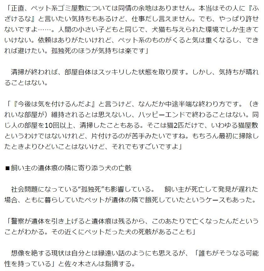「正直、ペット系ゴミ屋敷については同情の余地はありません。本当はその人に『ふざけるな』と言いたい気持ちもあるけど、仕事だし言えません。でも、やっぱり許せないですよ……。人間の小さい子どもと同じで、犬猫も与えられた環境でしか生きていけない。依頼はありがたいけれど、ペット系のものがくると気は重くなるし、できれば避けたい。孤独死のほうが気持ちは楽です」