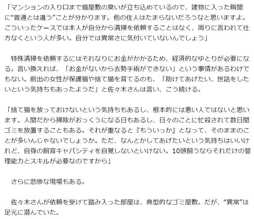 特殊清掃を依頼するにはそれなりにお金がかかるため、経済的なゆとりが必要になる。言い換えれば、「お金がないから去勢手術ができない」という事情があるわけでもない。前出の女性が保護や捨てを育てるのも、「助けてあげたい、世話をしたいという気持ちもあったようだ」と佐々木さんは言い、こう続ける。