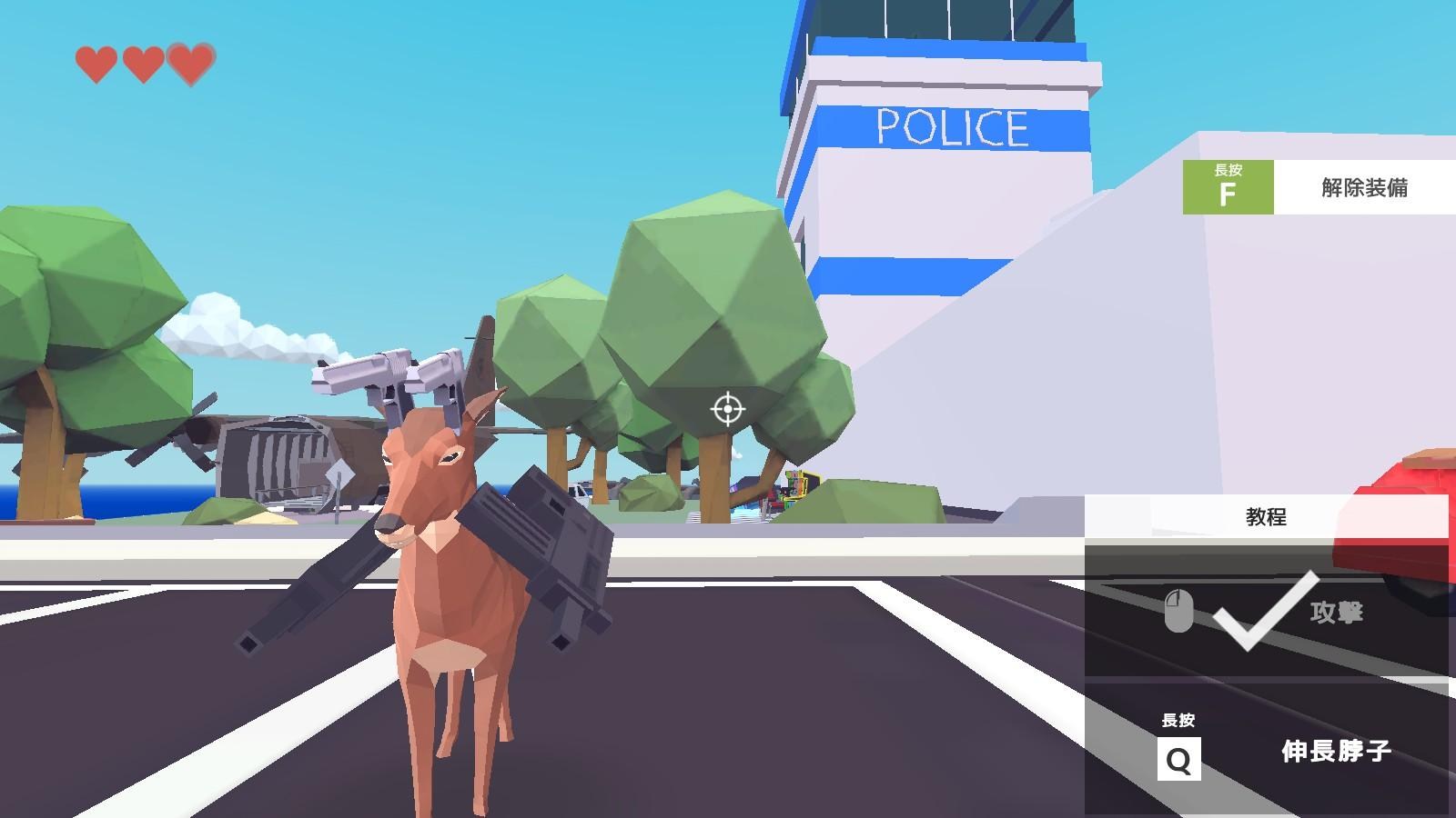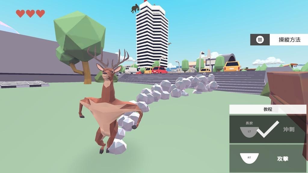 鹿大哥在這個城市中逛累了,便開始到處搞破壞。遊戲設計看到的全部都可砸爛,之後會掉寶,可以撿拾添加武裝鹿大哥,甚至可抓其它動物。
