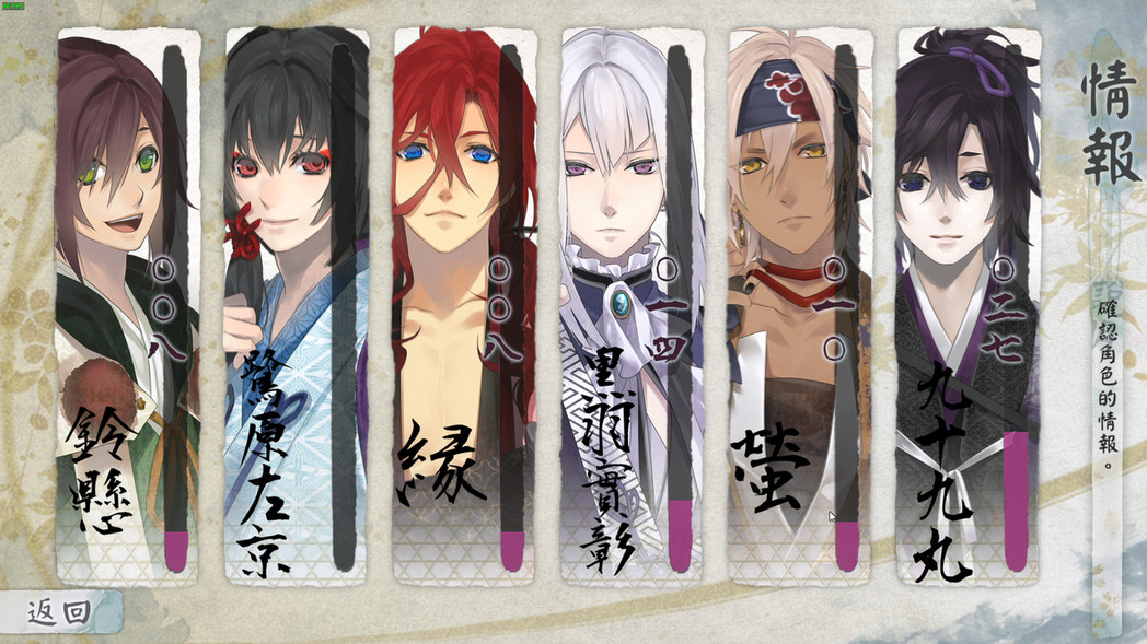 就背景來看,我們就是要攻陷這六位男主啦,六位男主的性格跟背景故事各有所長,絕對可以滿足各位太太們不同的口味(喂),有從小就跟妖怪一起長大的山林小子、補快、密探、還有有著特殊信仰的武士,以及一心只想復仇的腹黑美男(我好害怕劇透啊XDDD),玩家可以透過故事的進行,與六位護衛武士培養感情,並透過選項,瞭解後續的分支劇情。