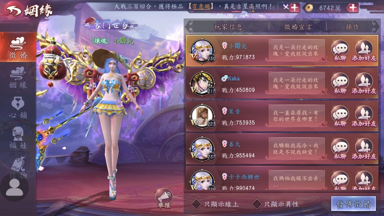 在達到213等時即會開啟姻緣系統,玩家可以在裡面發布徵婚啟事,或是在啟事上尋找與自己合拍的對象,這個算是個人覺得滿貼心的一個小設計,比起在茫茫人海中自己尋找對象,能夠直接透過啟事來尋找或是公開徵婚,比較能進一步提升成功找到另一半的機會呢!