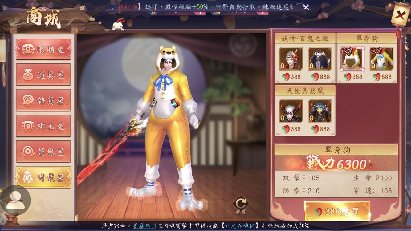 遊戲中的時裝目前還不多,男性的部分雖然只有三套,但是其中的「單身狗」造型是個人覺得很有趣的一套,可愛的狗狗造型時裝同時也代表自己是單身狗的形象,說不定穿著這套走在路上會有異想不到的邂逅發生?!