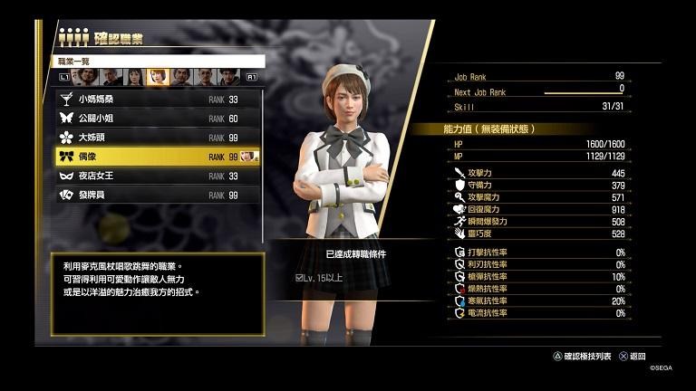 地圖算是歷代最大,3個地圖,新的橫濱異人町,舊的蒼天堀及神室町,戰鬥方式就是RPG,個人覺得還不錯,有不同職業,也有職業等級,升到某等級可以學到必殺技及極技。一樣小遊戲有個難點,就是飛龍賽車,我卡了一段時間,獎盃沒過去要收集所有要素,但白金還是滿花時間,後來加上DLC頂級大師包更花時間,整體來說難度不高也不低,但滿推薦本款,是不錯玩。