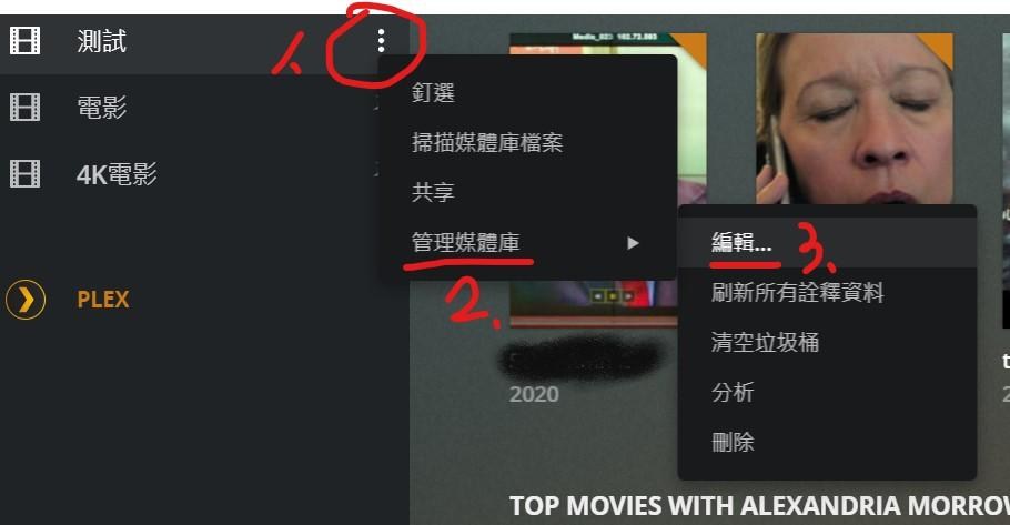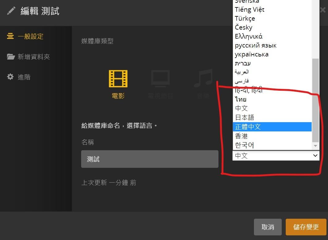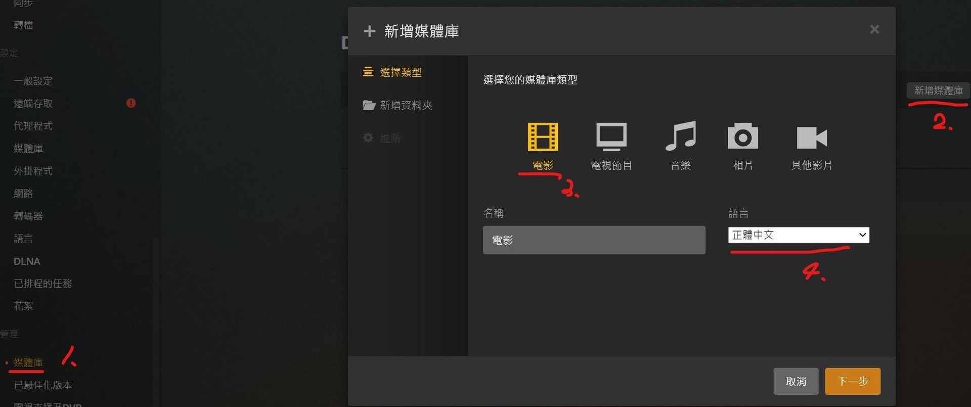 6.點左邊"管理"下方的"媒體庫",再點右上的"新增媒體",選"電影",語言選"正體中文",這邊要特別說一下,我這邊教學的都是"電影"檔案為主,如果你有影集的資料夾理論上是可以在新增媒體時選擇"電視節目",這樣PLEX就會替影片抓取詮釋資料,但我建議不要,因為我的經驗是檔名會亂抓,影集類型可以選"其他影片",放棄抓取詮釋資料,利用檔名辨識即可。