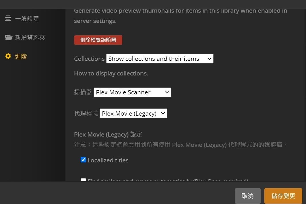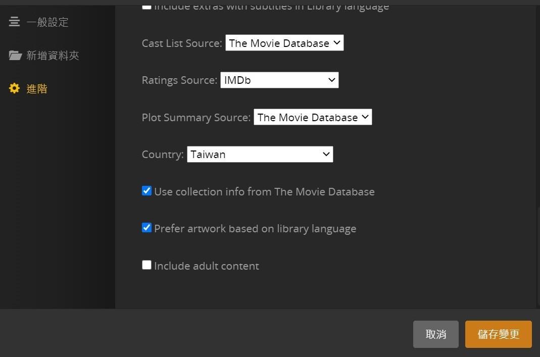 然後再照下圖把"代理程式"改成"Plex Movie(Legacy),往下拉country改成Taiwan