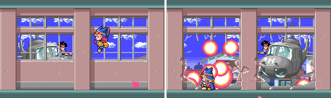好在機關槍的攻擊判定較小,趁他打過來時跳到另一邊即可迴避,總共會遇到兩次