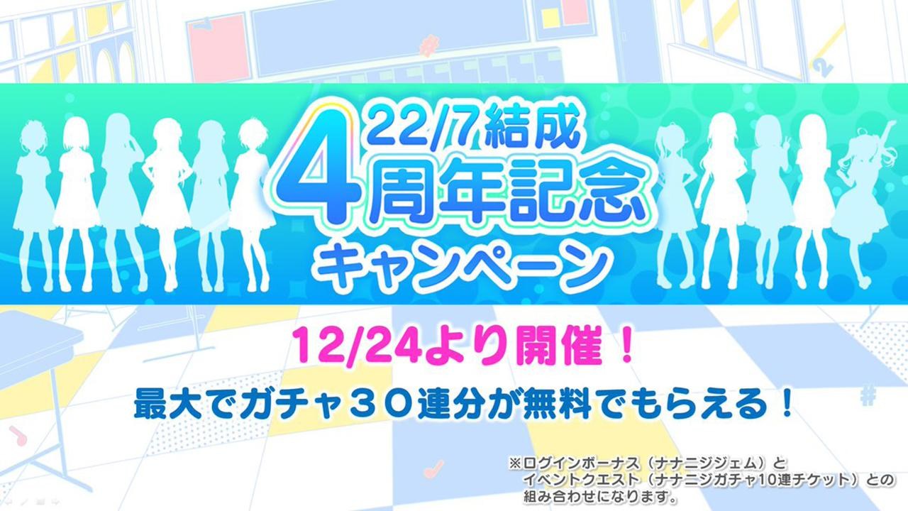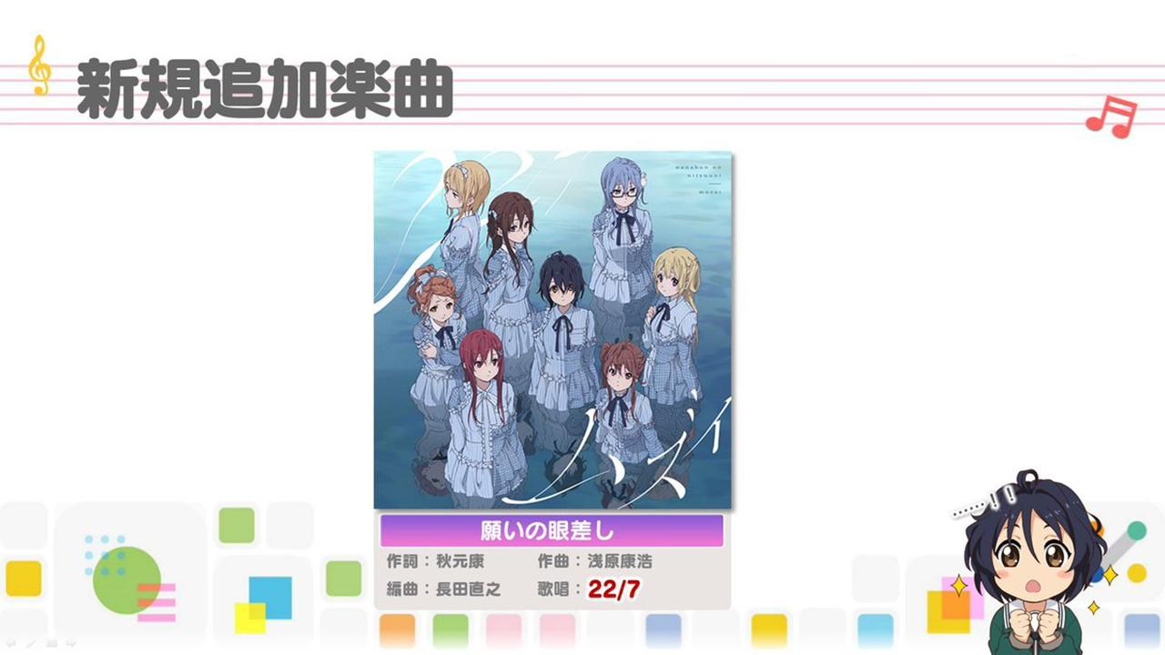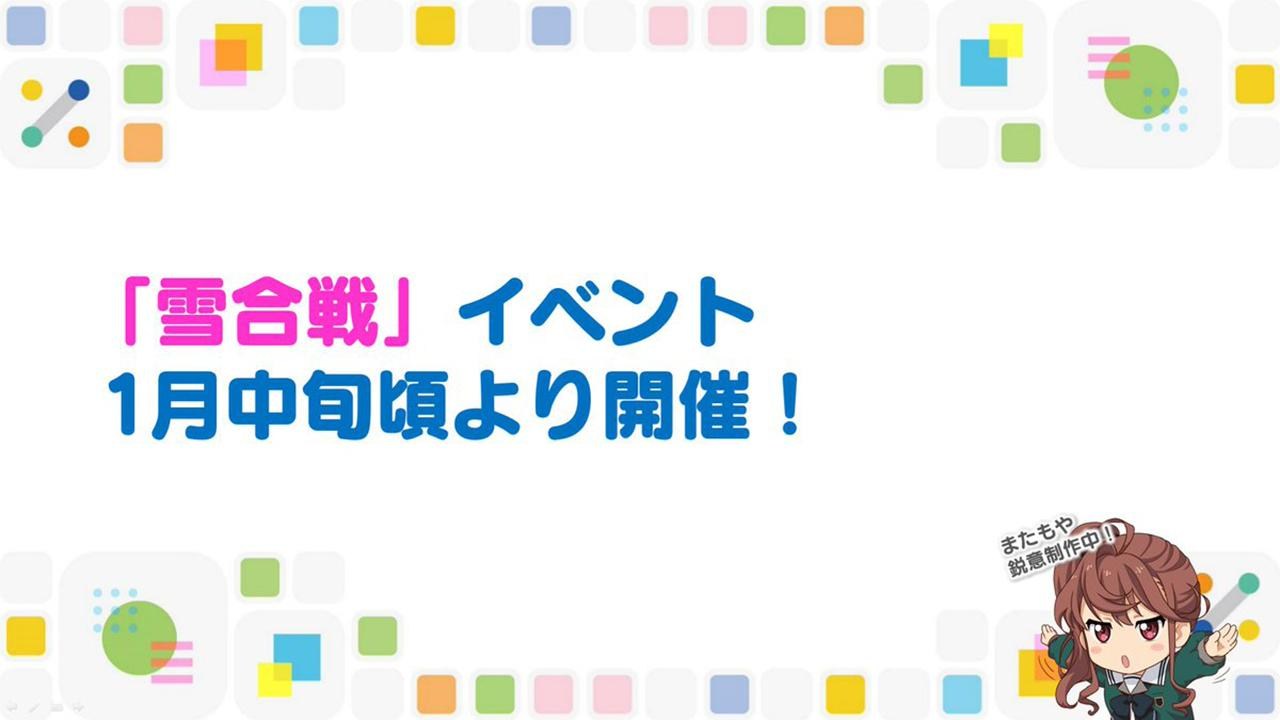 遊戲預計於明年1月中旬舉辦「雪合戰」活動。此外也將新增《22/7》樂曲之一的「願いの眼差し」以及主線第3章劇情的追加。
