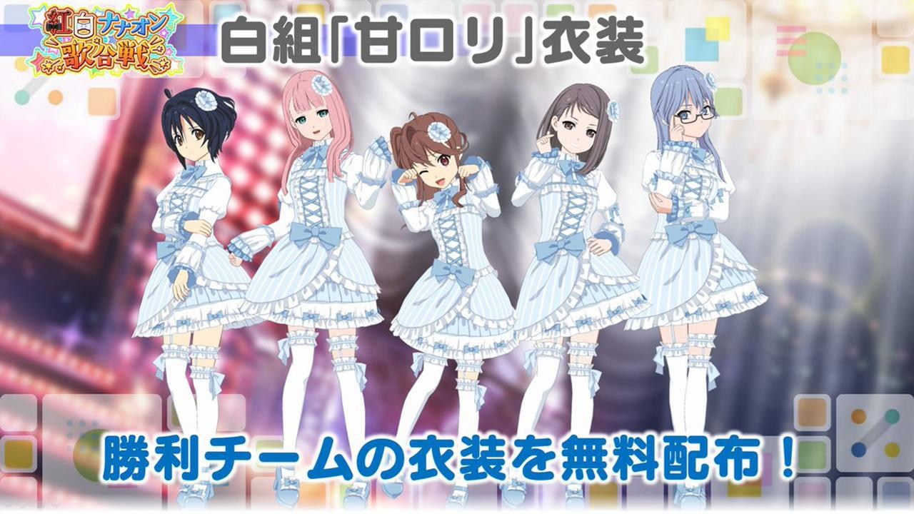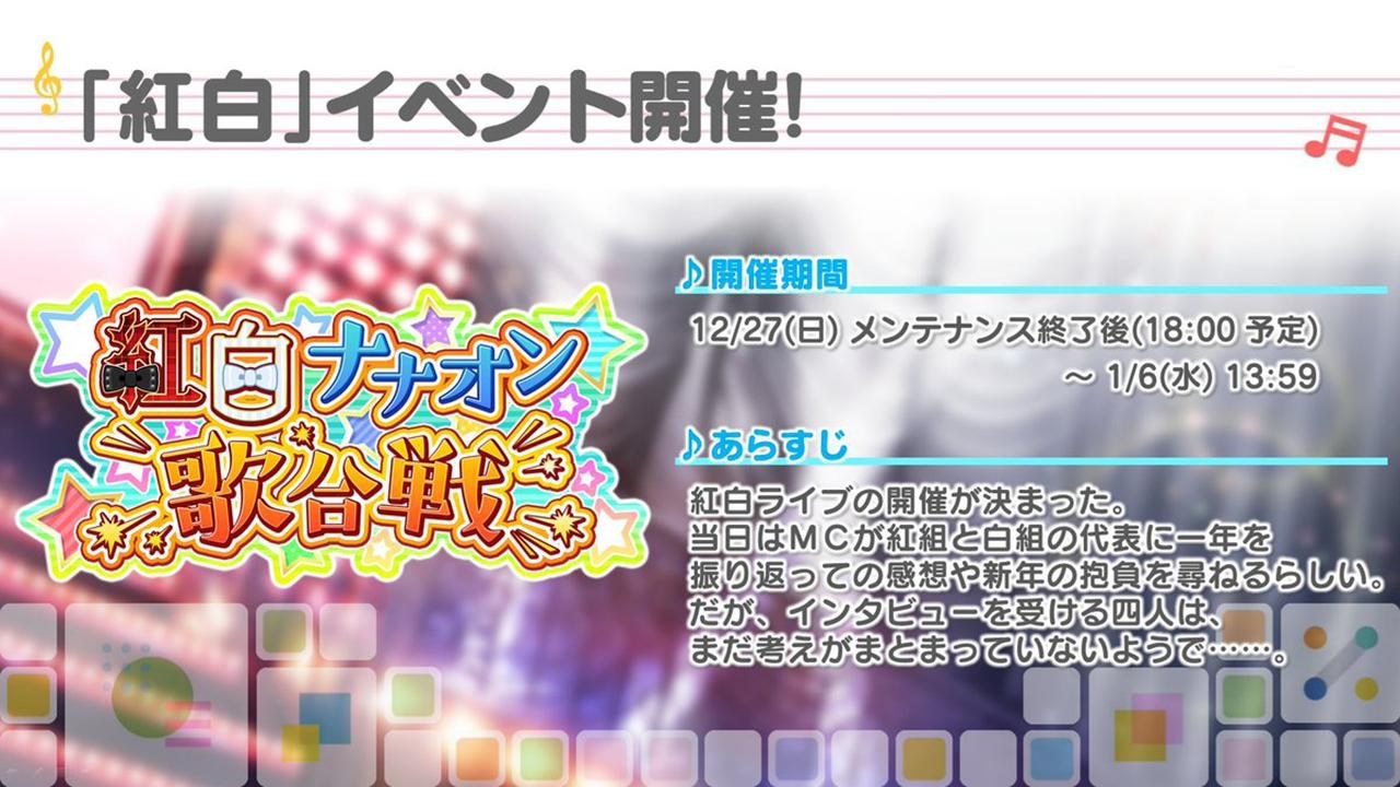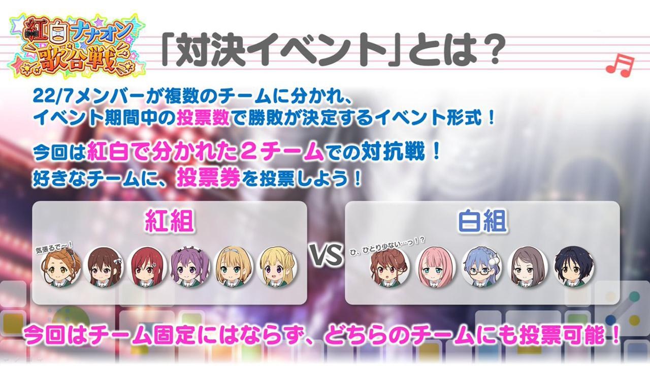 遊戲將於12/27 (日) 更新後舉辦「紅白歌合戰」活動!活動中 22/7 成員將分成紅、白兩組進行投票比賽,與以往限制只能投給單一組別不同,玩家這回可以自由投票給喜歡的組別。角色服裝由成員裡的東條悠希役 #高辻麗 所設計,分別為紅組「パンクゴシック」與白組「甘ロリ」。最終勝出的隊伍服裝將免費贈予玩家!