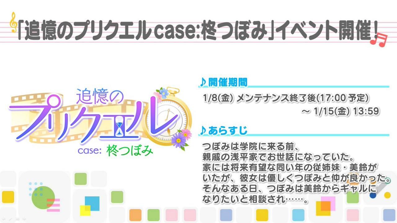 遊戲於明年 1/8 (五) 更新後將舉辦「追憶的前日談:柊蕾」活動,屆時將新增柊蕾的新4星卡片以及《22/7》樂曲之一的「足を洗え!」。