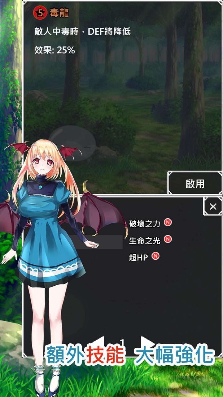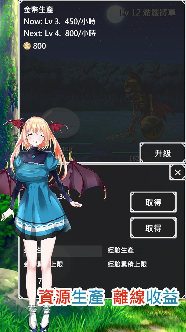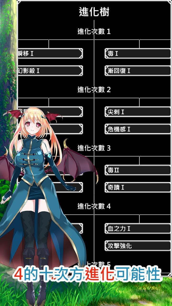一開始就可進化一次。在打敗敵人,得到金幣和經驗後,可提升放置金幣或經驗值。每20級可進化一次,並取得兩種技能。也可透過不斷重生,嘗試不同的進化路徑。成為最強大的魔物哦!