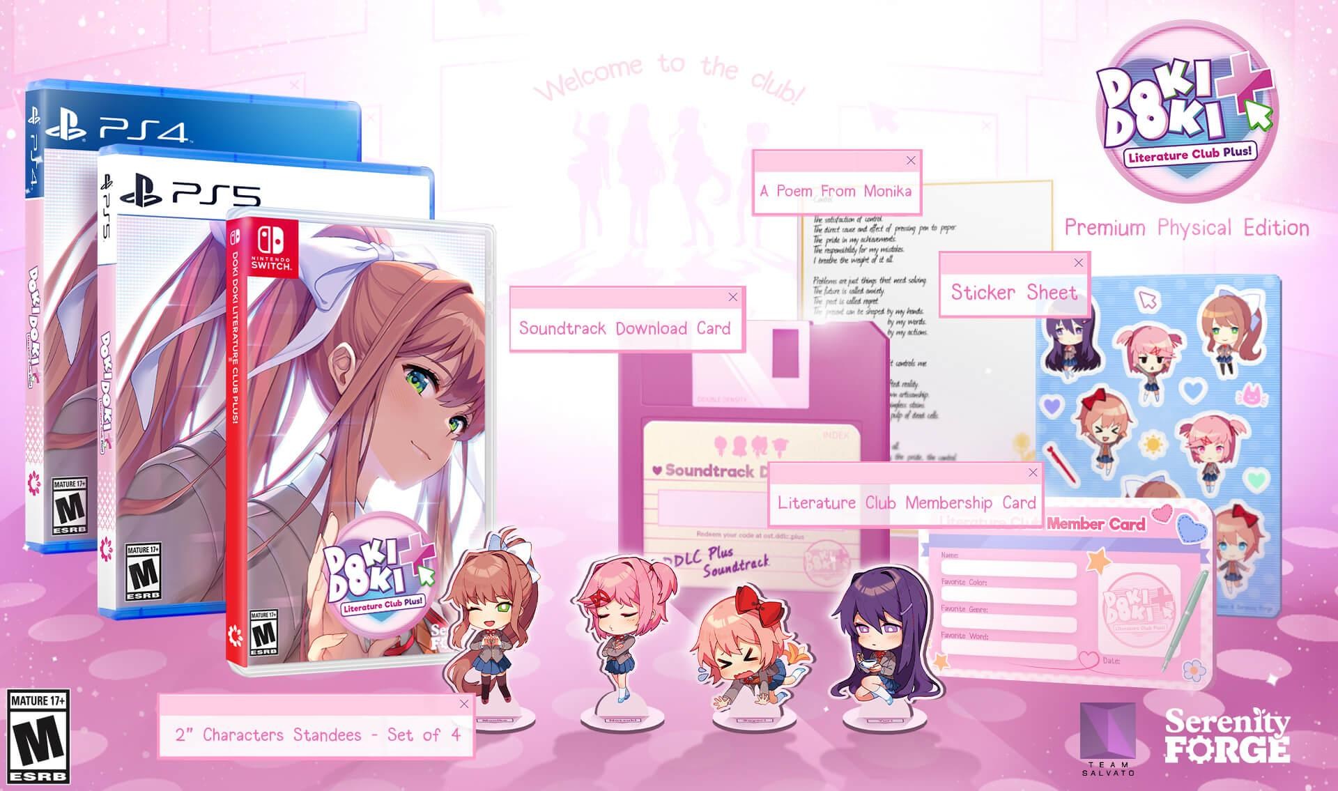 心跳文學社 Plus!》在各平台上以 14.99 美元的價格提供下載,而 PlayStation 4、PlayStation 5 和 Nintendo Switch 版也有推出售價 29.99 美元實體版,其中包括壓克力支架、由莫妮卡寫的詩和原聲帶下載代碼。附帶一提,Serenity Forge 商店可運送至海外,有興趣的玩家不妨參考。