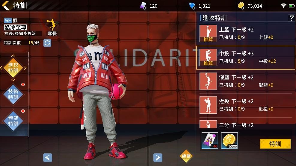 除了專屬技能、特性技能、爆發技能之外,也可以透過特訓的方式,個別強化進攻、技術、體能,比我的小前鋒楓來說,我就選擇了中投、運球、跑動這三個能力,是比較符合我喜歡跑動打機動的玩法,當然也是可以選擇強化三分或是灌籃讓玩法變得更多元。