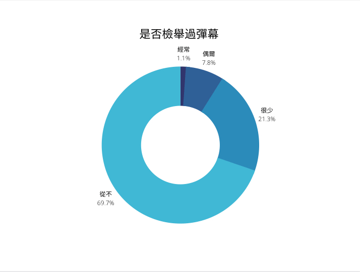 431筆填答中,高達69.6%的人(300人)未曾檢舉過彈幕,21.3%(92人)自認很少檢舉,7.8%(34人)偶爾檢舉,1.1%(5人)經常檢舉。(見圖七)