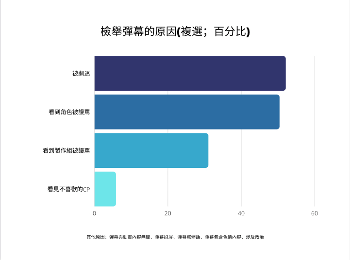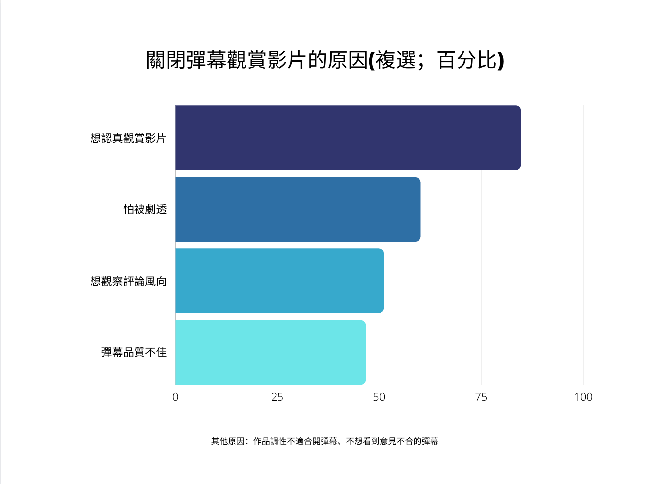另外,即使已經設立「想認真觀賞影片」的選項,仍有多人在其他欄特別補充,太多彈幕阻擋視線破壞氣氛,也可能因為看彈幕講話而沒看到劇情(還要拉回去看很煩),此外也有「想截圖」、「會遇到銅價(同嫁)」、不想遇到其他作品的粉絲「傳教」、想避開「自己聊起天的彈幕」等考量。