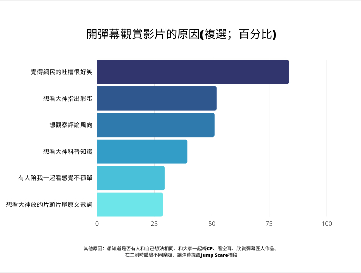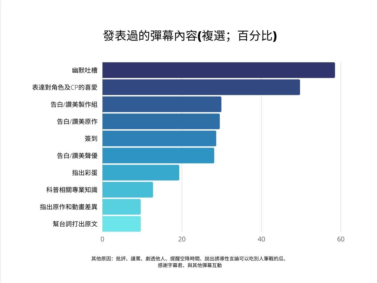 雖然彈幕比起平台的其他要素,在用戶心中是頗為次要的功能,但在多數用戶選擇「偶爾」開彈幕時,這個功能仍然增加了許多人觀看影片時的樂趣、滿足人獲取相關知識及尋求共鳴的需求,其中開彈幕的原因,又以「覺得網民的吐槽很好笑」為大宗;雖然僅有53.1%的用戶會發彈幕,但也創造了五花八門的使用方式,最多人發的「幽默吐槽」,與最多人開彈幕的原因相符合。